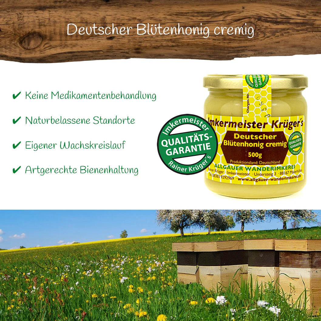 Honig ist ein reines von Bienen gesammeltes Naturprodukt ohne Zusätze jeglicher Art. Honig besteht aus 87% Frucht- und Traubenzucker sowie Aromen und Pflanzenstoffen.Deutscher Blütenhonig cremig kommt im 500g Glas.