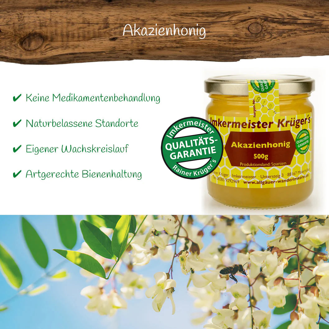 Honig ist ein reines von Bienen gesammeltes Naturprodukt ohne Zusätze jeglicher Art. Honig besteht aus 87% Frucht- und Traubenzucker sowie Aromen und Pflanzenstoffen.Deutscher Akazienhonig kommt im 500g-Glas.