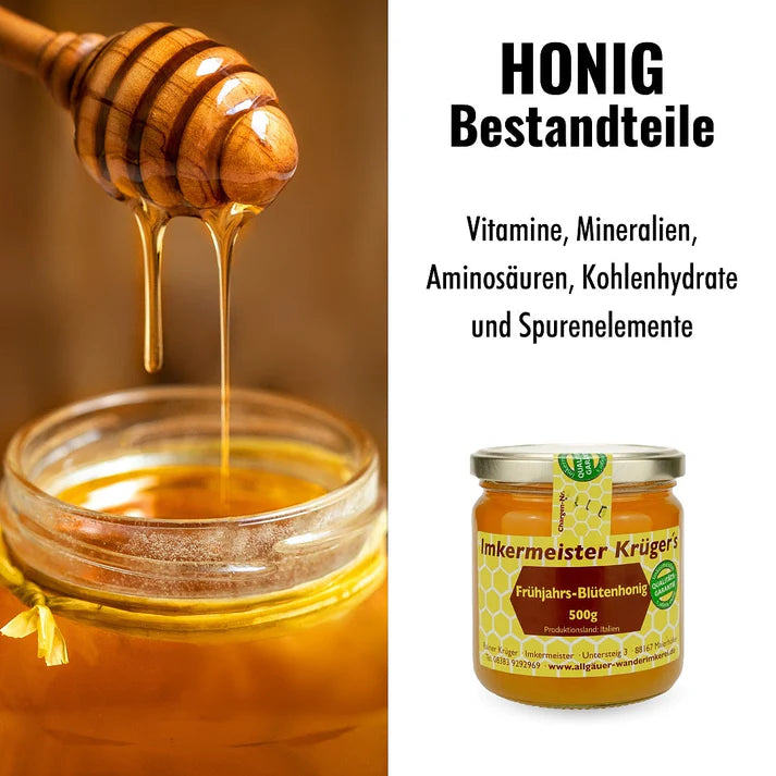 Honig ist ein reines von Bienen gesammeltes Naturprodukt ohne Zusätze jeglicher Art. Honig besteht aus 87% Frucht- und Traubenzucker sowie Aromen und Pflanzenstoffen.Frühjahrs-Blütenhonig kommt im 500g-Glas.