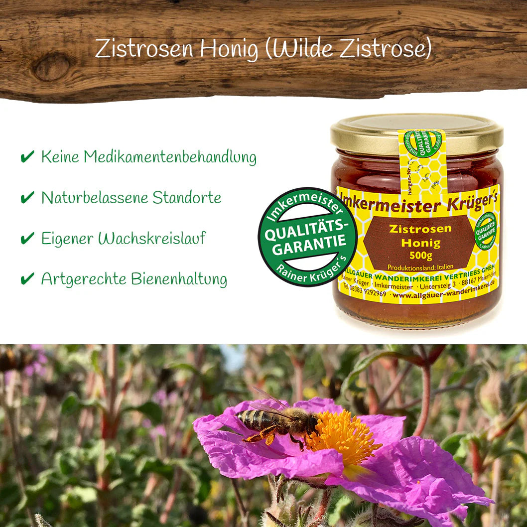 Honig ist ein reines von Bienen gesammeltes Naturprodukt ohne Zusätze jeglicher Art. Honig besteht aus 87% Frucht- und Traubenzucker sowie Aromen und Pflanzenstoffen.Zistrosen Honig kommt im 500g-Glas.