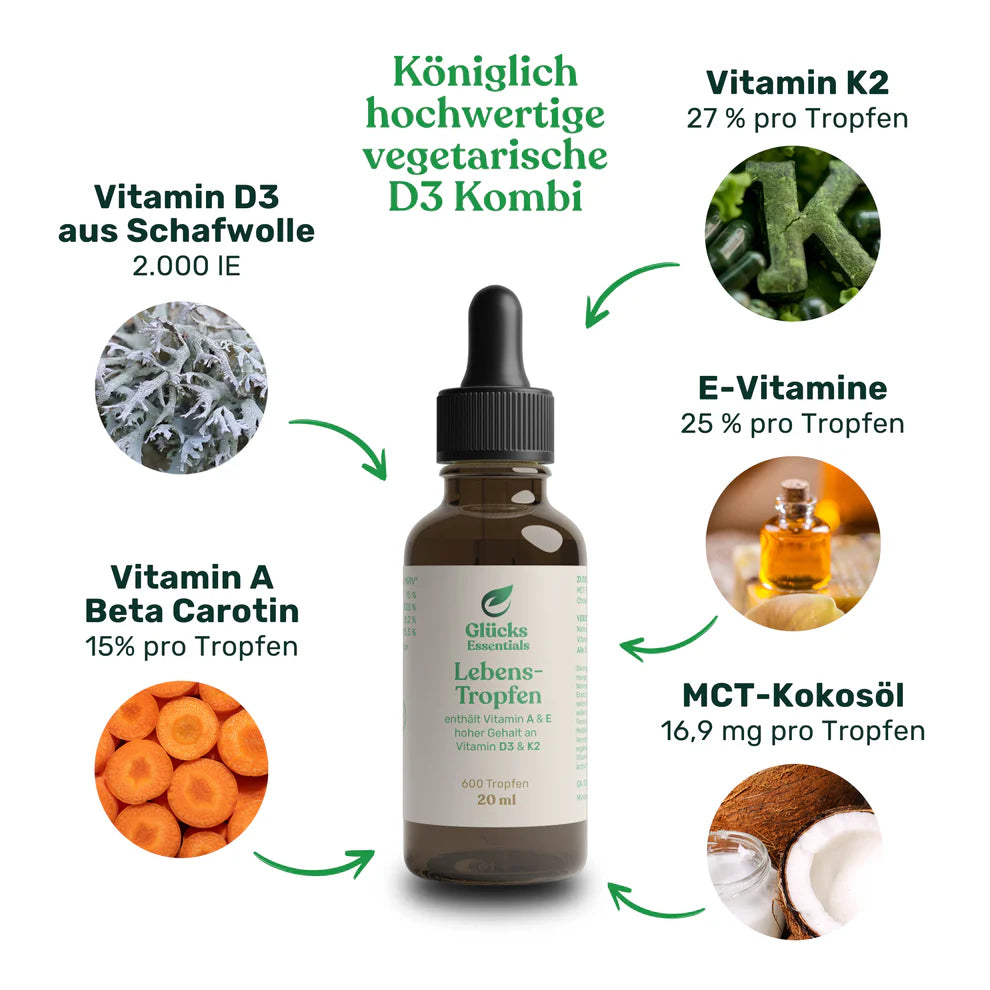 Unsere Lebens-Tropfen enthalten eine ausgewogene Kombination fettlöslicher Vitamine: Vitamin D3, Vitamin E, Vitamin K2 und Vitamin A. Sie sind in hochwertigem MCT-Öl aus der Kokosnuss gelöst, was eine hohe Bioverfügbarkeit ermöglicht.