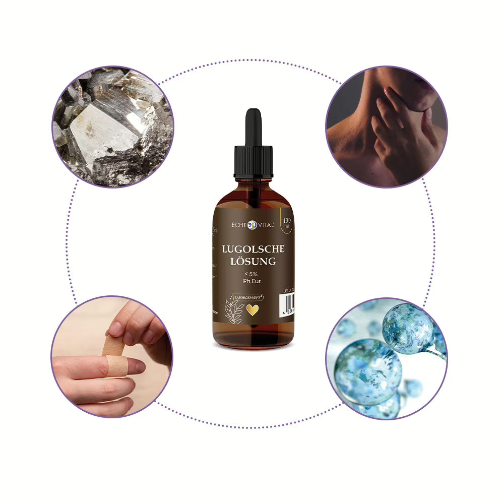 Lugolsche Lösung < 5 % Ph. Eur. 100 ml - elementares Iod (< 5 %) und Kaliumiodid (< 10 %) in hochwertigem, demineralisiertem Wasser (Ph. Eur.).