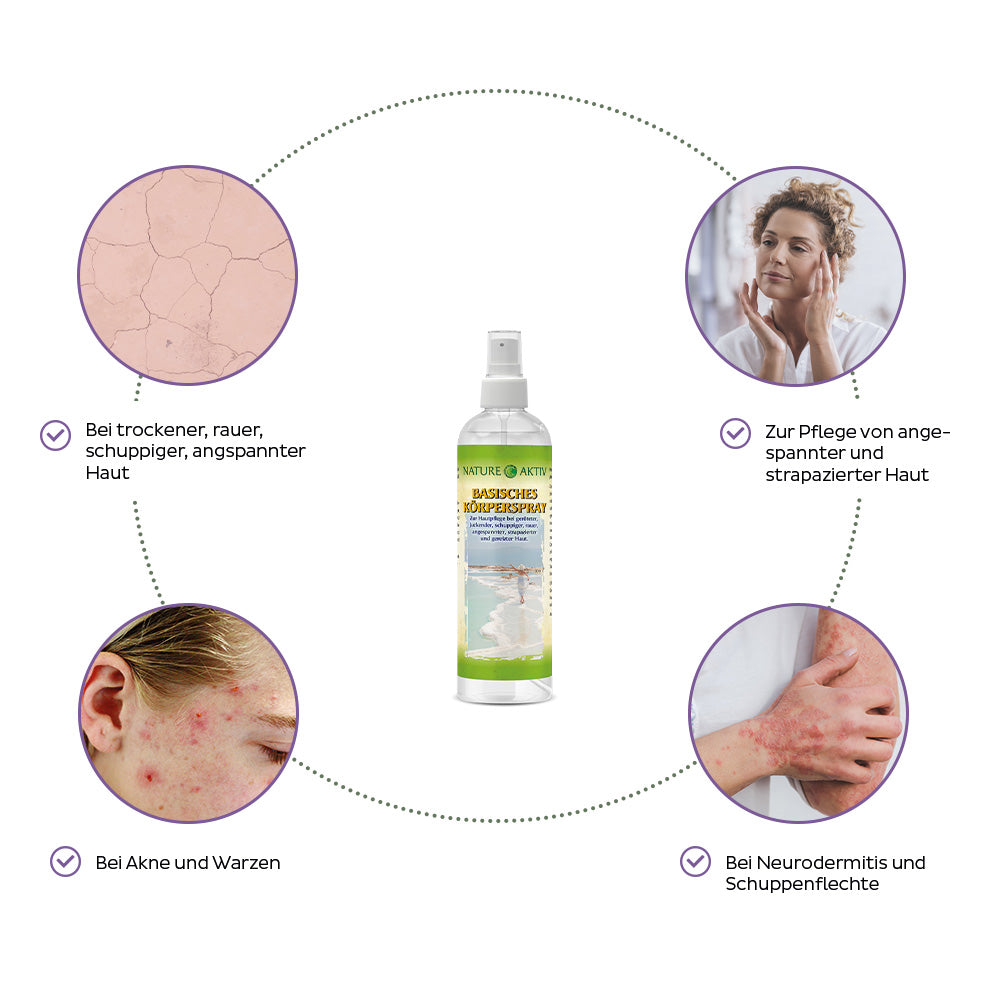 Der hohe basische pH-Wert in unserem NATURE AKTIV Basenspray erlaubt unserer Haut sich selbst zu regulieren und überschüssige Säuren zu neutralisieren. Unsere Haut wird entlastet und der Säureschutzmantel kann wieder aufgebaut werden.