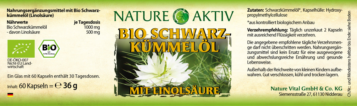 Nahrungsergänzungsmittel aus Bio Schwarzkümmelöl mit Linolsäure.