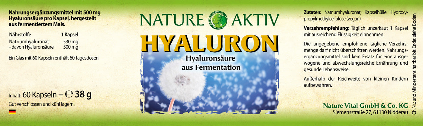 ECHT VITAL Hyaluron wird zu 100 % aus rein pflanzlichen Rohstoffen hergestellt. Von uns wird ausschließlich Hyaluronsäure aus Fermentation von Mais verwendet. Unser Produkt ist mit 500 mg reiner Hyaluronsäure pro Kapsel hochdosiert.