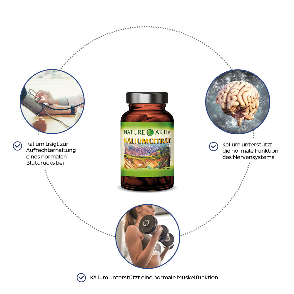Kaliumcitrat Kapseln in Pharmaqualität. Für Nerven, Muskeln und Blutdruck. 36 % Kaliumanteil. Gut verträglich.