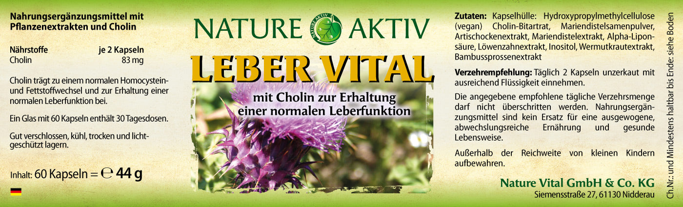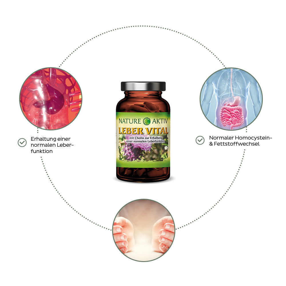 Unsere Leber ist ein wahres Allround-Talent. Als solches ist das Organ am Stoffwechsel, der Verdauung und insbesondere der Entgiftung unseres Körpers beteiligt. Hierbei stellt die Leber ein lebensnotwendiges Organ dar. Durch ihr Zusammenspiel mit der Galle und dem Darm speichert die Leber Vitamine, Mineralstoffe, Fette und Zucker. Hierbei hat unsere Leber die Fähigkeit, sich zu regenerieren und von negativen Einflüssen zu erholen. Dennoch kann es sinnvoll sein, das Organ bei der Erholung von negativen Einflüssen wie beispielsweise einem erhöhten Alkoholkonsum oder anderen Belastungen zu unterstützen. Das in unserem Leber Vital enthaltene Cholin trägt zur Erhaltung einer normalen Leberfunktion bei und kann diese somit unterstützen.