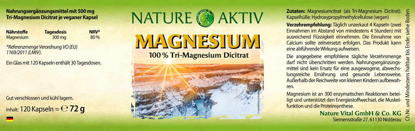 Nature Aktiv Magnesium ist in Form von Tri-Magnesium Dicitrat erhältlich. Tri-Magnesium Dicitrat wird rasch resorbiert und ist gut verträglich. Der Anteil an elementarem Magnesium liegt beim Tri-Citrat bei 15 %. Mit seinem neutralen bis basischen pH-Wert von über 8, schont es ebenfalls die Verdauung.