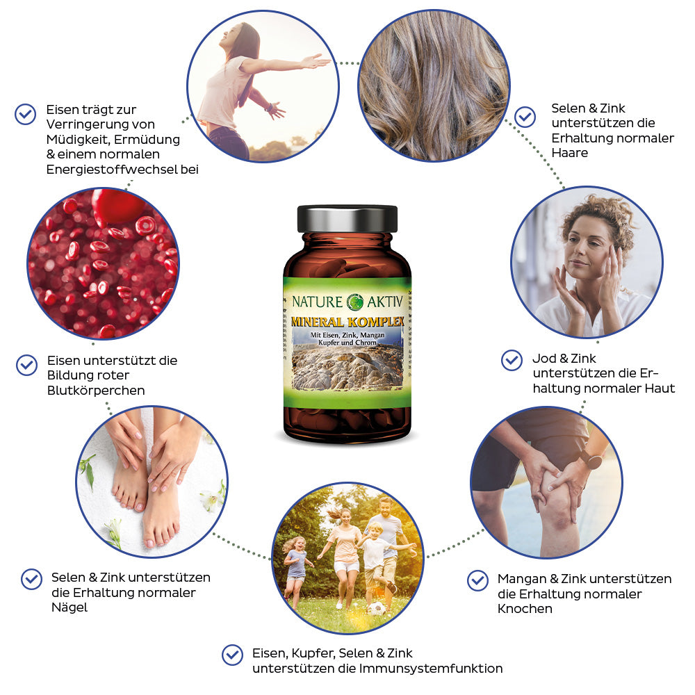 Kombination aus Mineralstoffen und Spurenelementen. Mit Eisen, Zink, Mangan, Kupfer, Chrom, Jod, Molybdän und Selen.