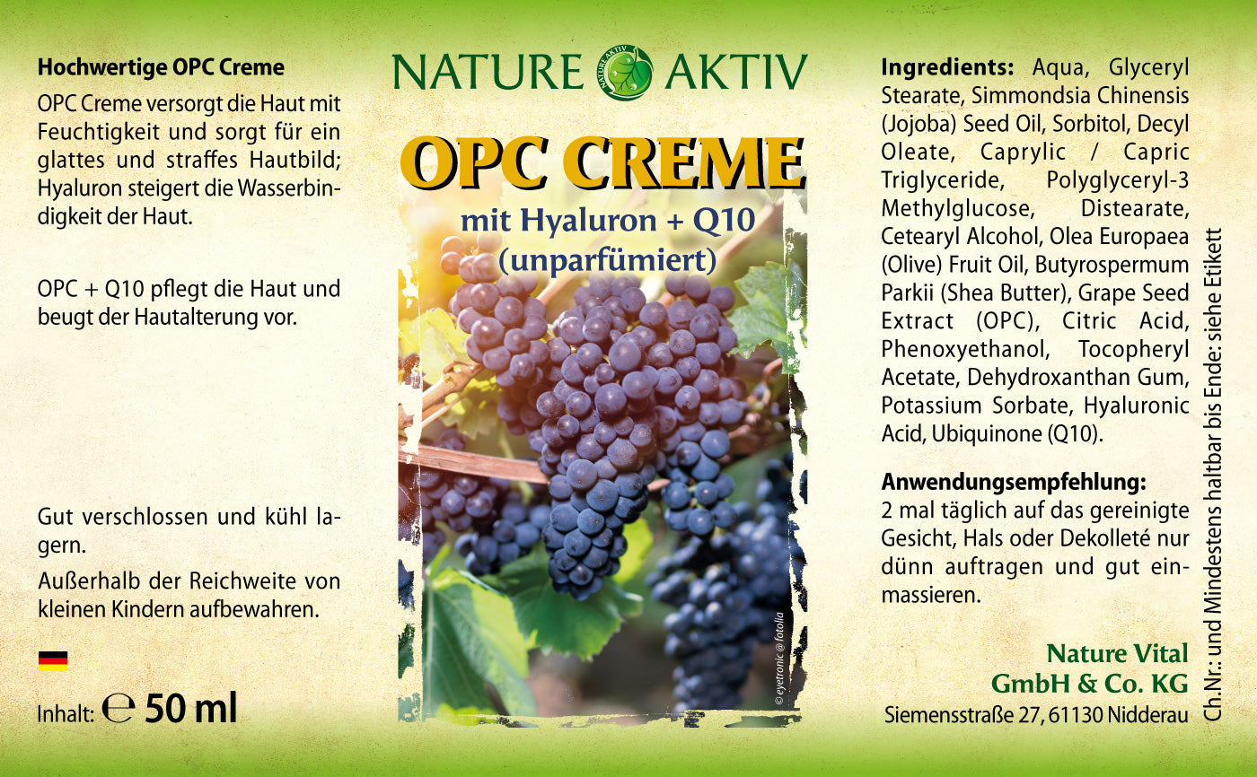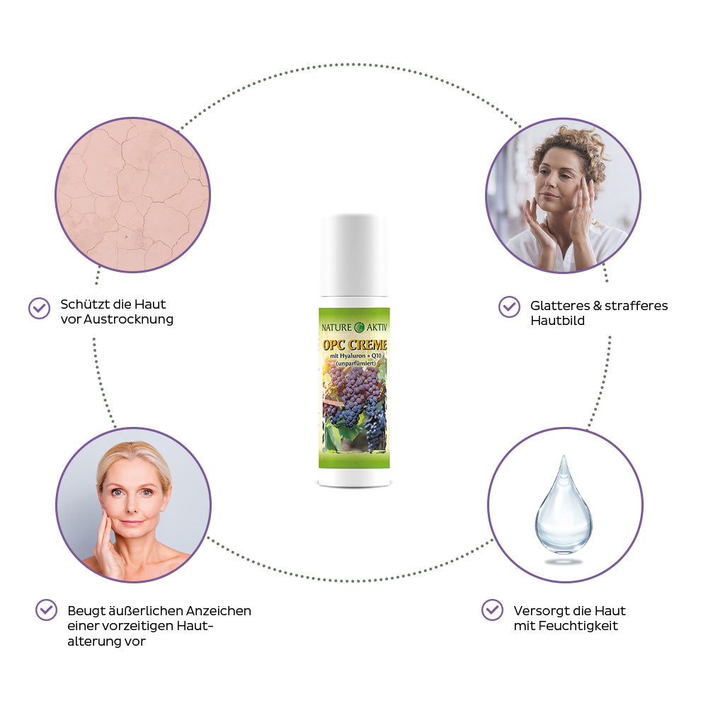 Nature Aktiv OPC CREME versorgt die Haut mit Feuchtigkeit und sorgt für ein glatteres und strafferes Hautbild; Hyaluron steigert die Wasserbindigkeit der Haut. OPC + Q10 pflegt die Haut und beugt den äußerlichen Anzeichen einer vorzeitigen Hautalterung vor. Sheabutter, Olivenöl und Jojobaöl schützen zudem die Haut vor Austrocknung.