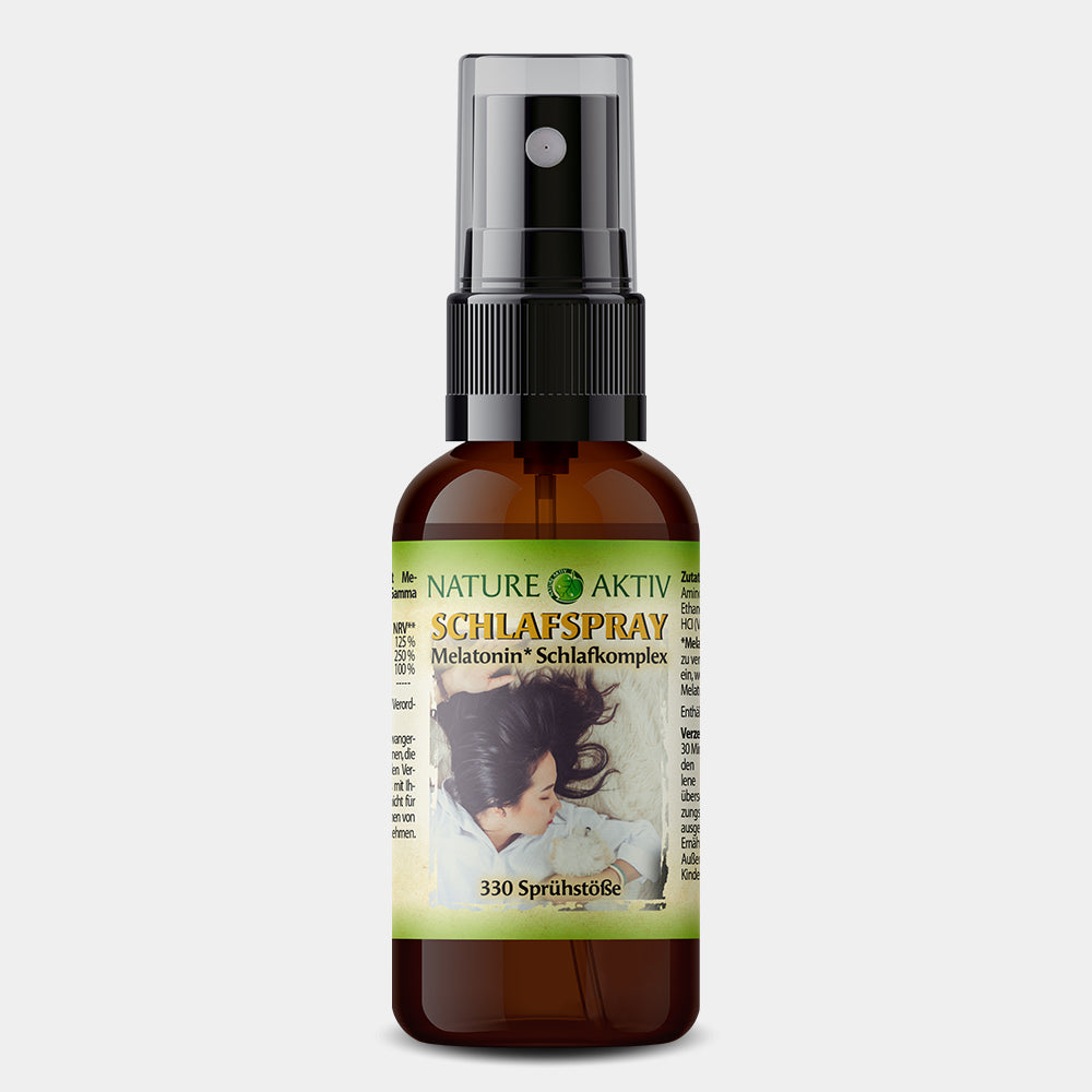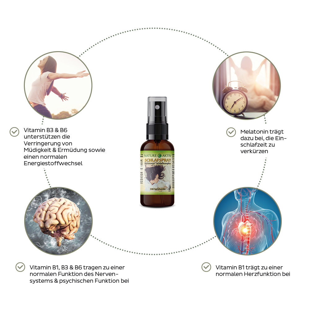 Unser Nature Aktiv Schlafspray enthält wertvolle Mikronährstoffe wie ausgewählte B-Vitamine, das Schlafhormon Melatonin und den Botenstoff GABA. Melatonin trägt dazu bei, die Einschlafzeit zu verkürzen, während die B-Vitamine eine normale Funktion des Nervensystems und des Energiestoffwechsels unterstützen.
